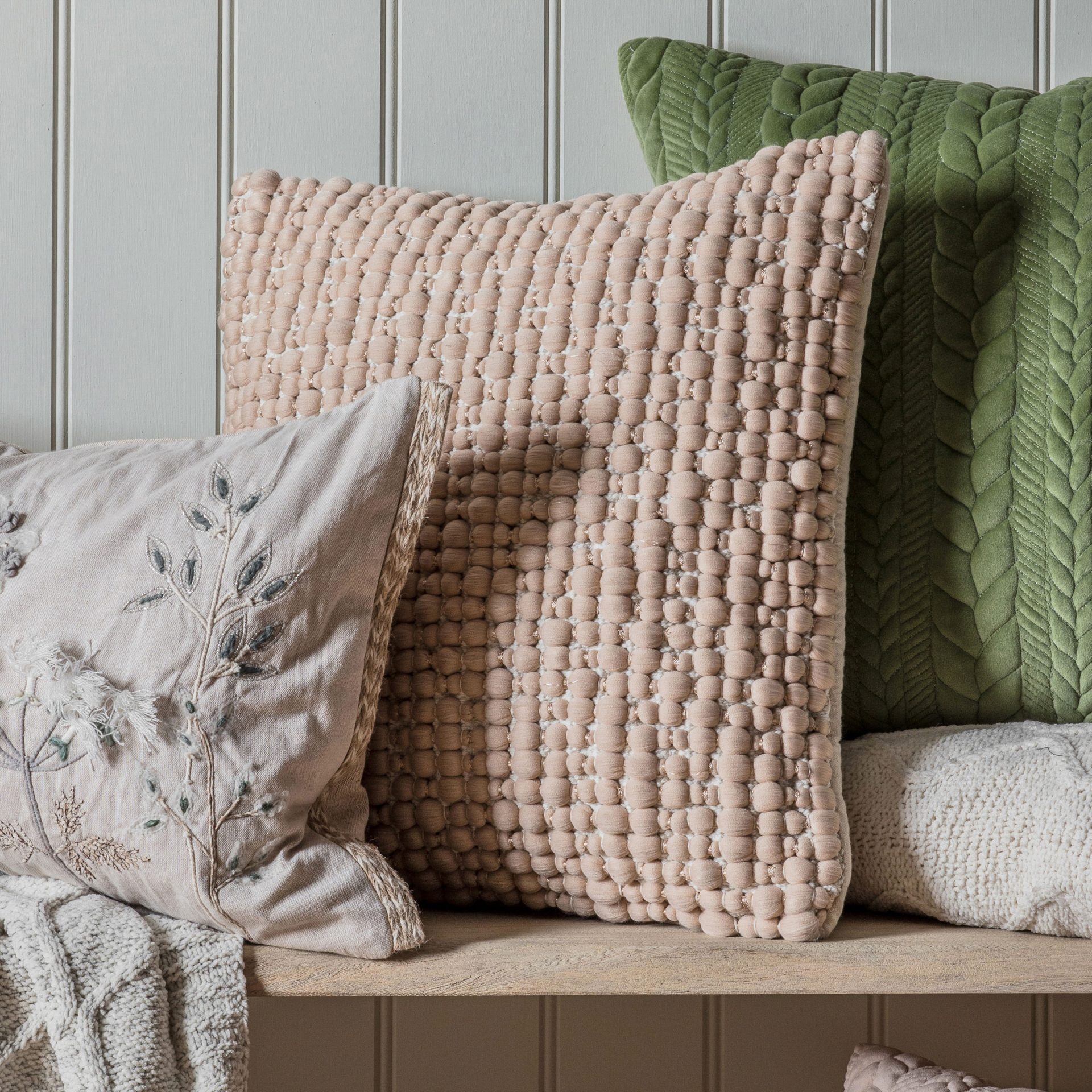 A richly textured neutral cushion with a woven bobble design to the front and a plain cotton backing. A harmonious accompaniment to a natural toned sofa or chair or add to a warmer scheme for balance. (w)450mm x (d)175mm x (h)450mm