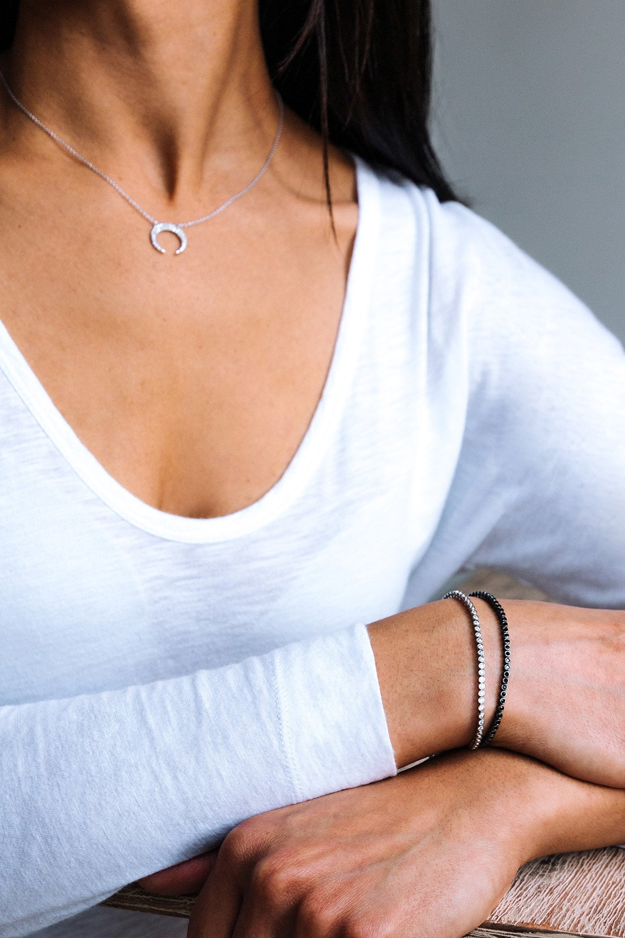Sterling silver pave crescent necklace. Sliding length adjuster, up to 45 cm length.